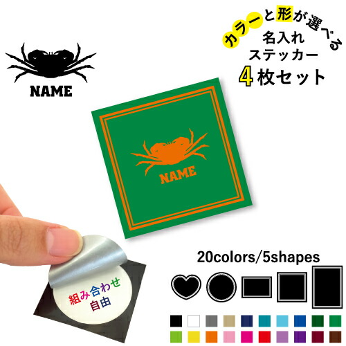 カニ 名入れ文字入れステッカー4枚セット 色と形が選べる シール 多目的ステッカー UVカット 円 ハート 正方形 長方形 スマホステッカー スマホケース 挟む シースルーシール 見せる 貼らない スマホ裏 蟹、甲殻類、魚介、Crab