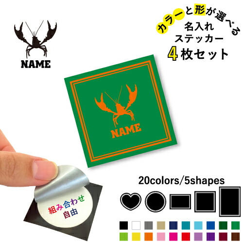ザリガニ 名入れ文字入れステッカー4枚セット 色と形が選べる シール 多目的ステッカー UVカット 円 ハート 正方形 長方形 スマホステッカー スマホケース 挟む シースルーシール 見せる 貼らない スマホ裏 クレイフィッシュ、Crayfish