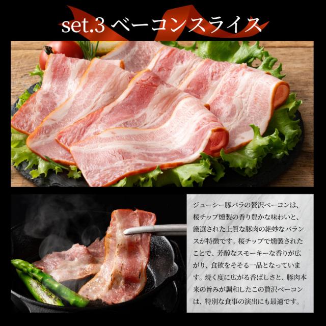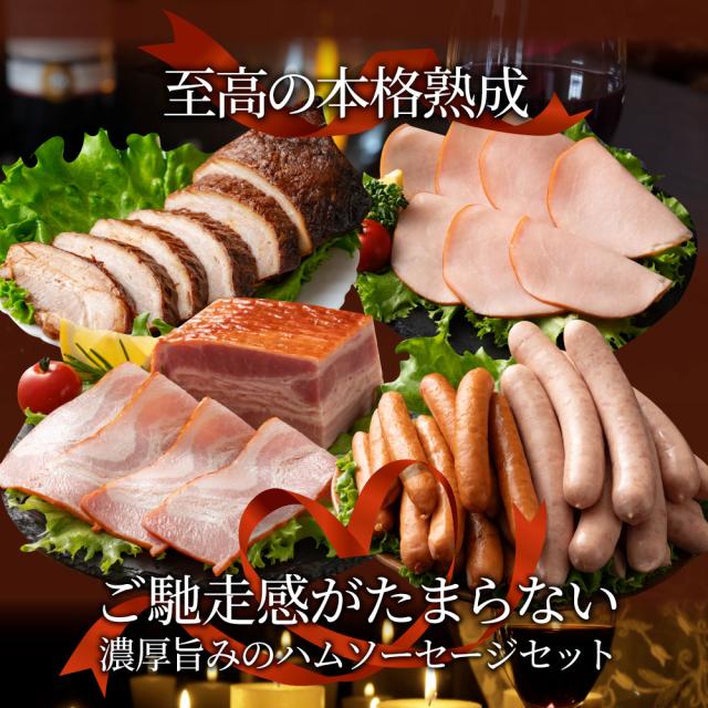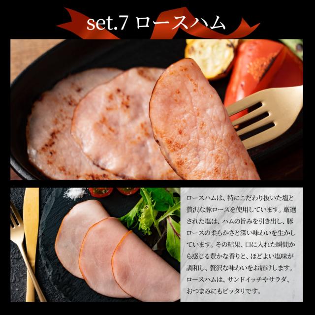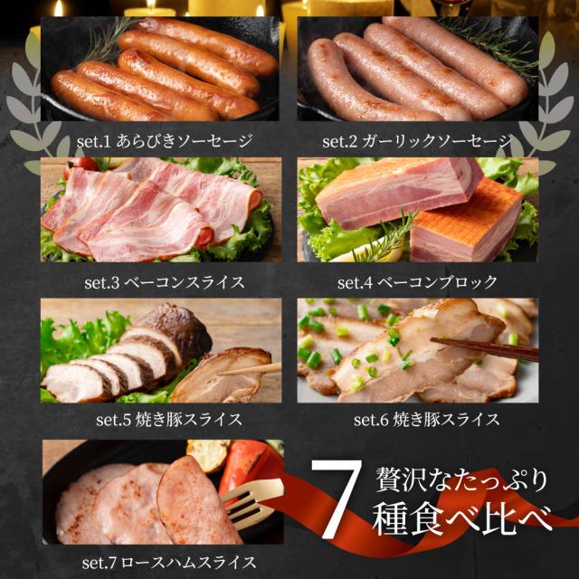 あらびきウインナー100g×4、ガーリックウインナー200g×1、焼き豚スライス100g×1、焼き豚ブロック400g×2、ロースハム100g×2、ベーコンスライス100g×2、ベーコンブロック200g×1