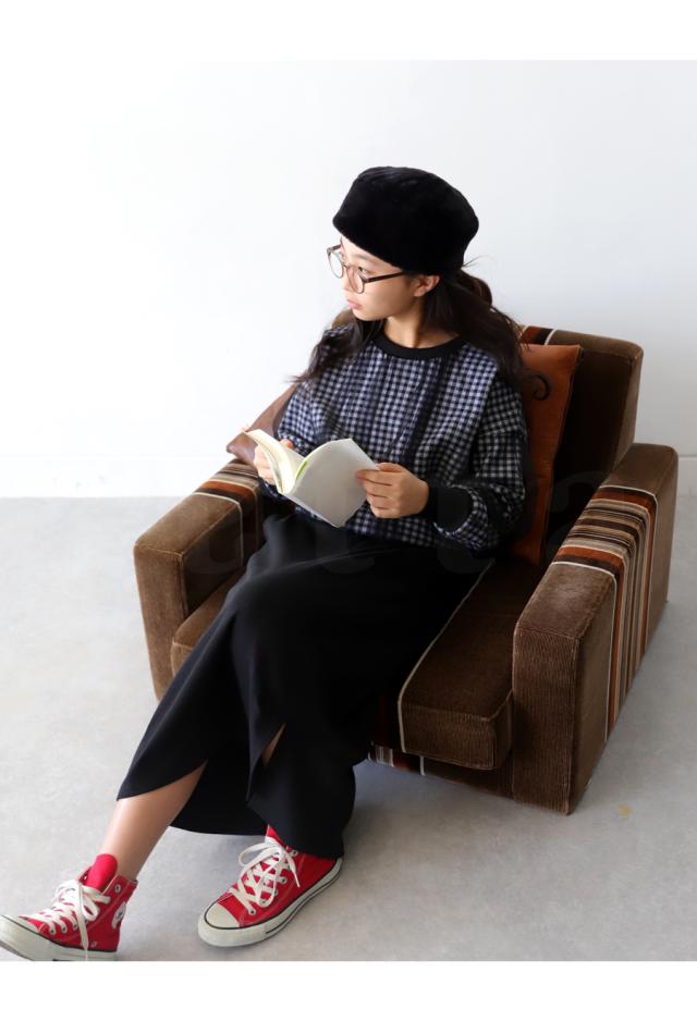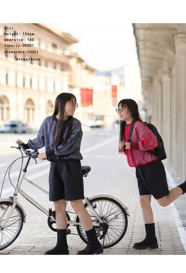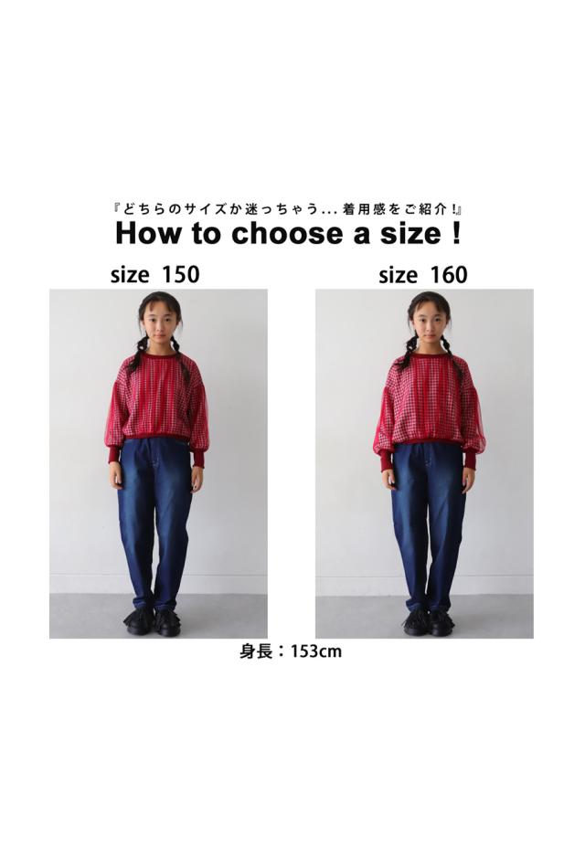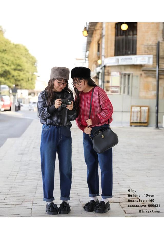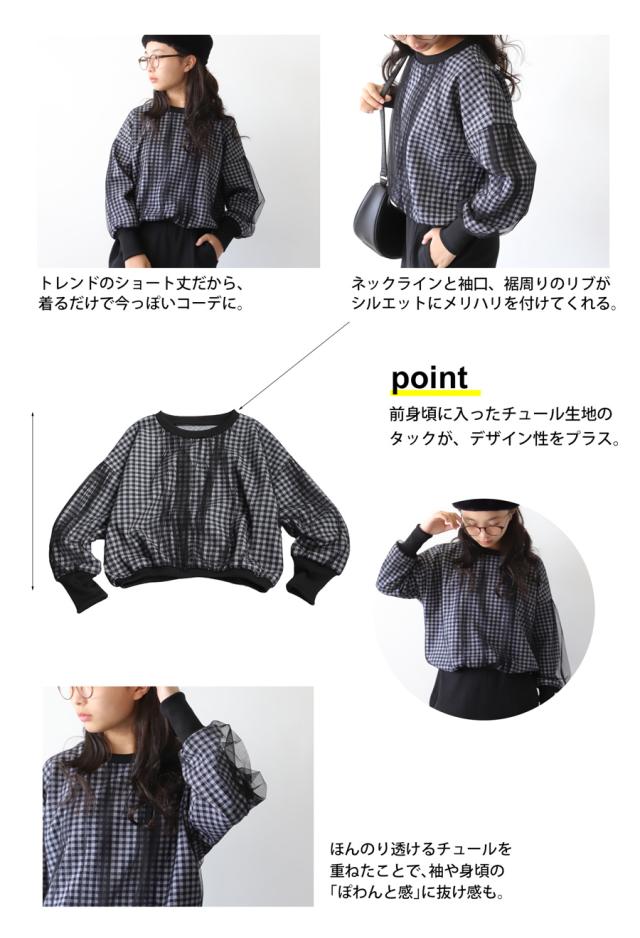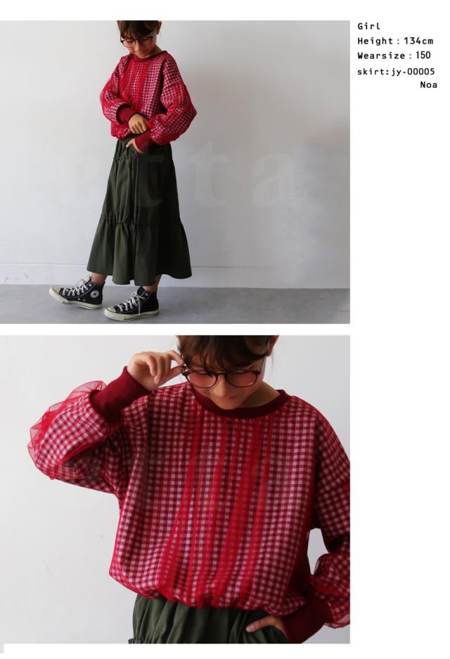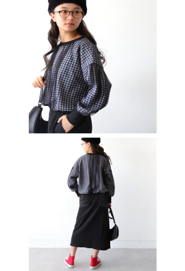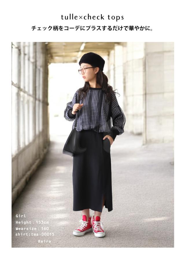 mra-0004 キッズ 子供服 女の子 ジュニア 高学年 中学生 中高生 長袖 丸首 クルーネック ギンガムチェック 柄トップス 柄 チュール デザイントップス リブ プルオーバー ゆったり