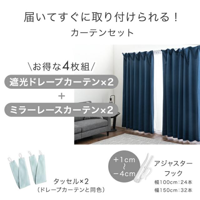 カーテン 4枚セット 遮光 幅100cm 丈105cm ドレープカーテン レースカーテン タッセル 遮光カーテン 1級 2級 既成 カーテン ミラーレース レース 遮像 断熱 節電 遮光カーテン 透けない 洗える 4枚 セット シンプル かわいい