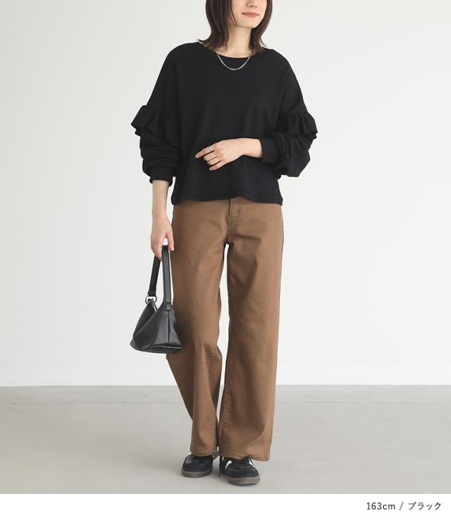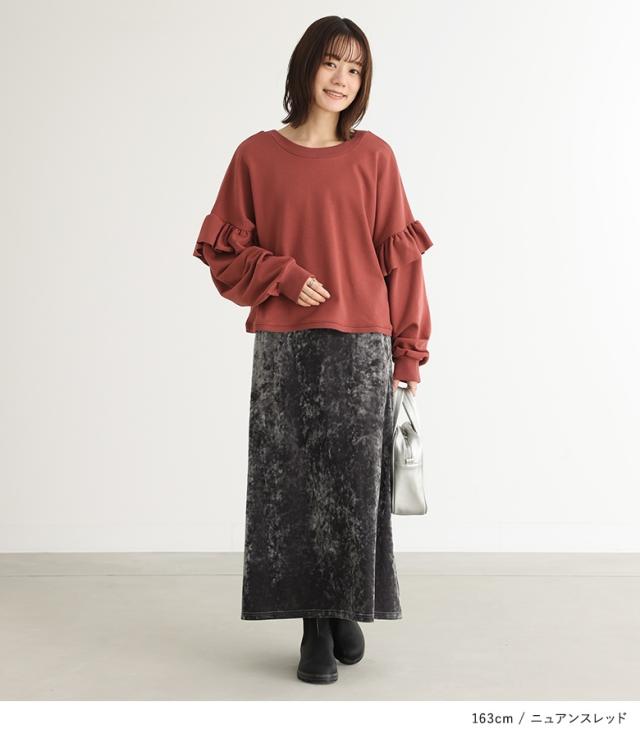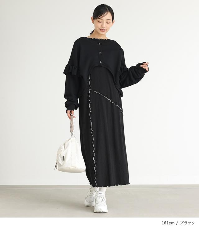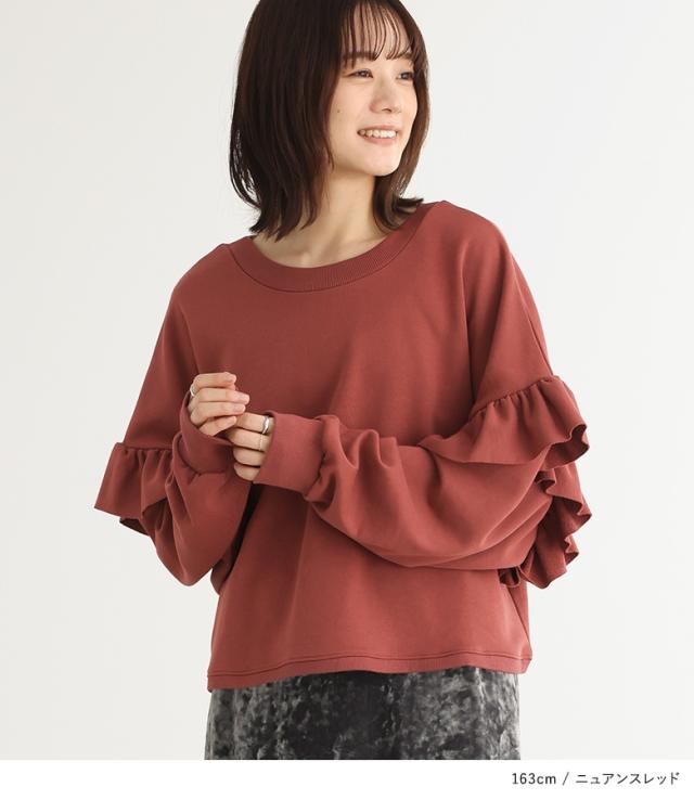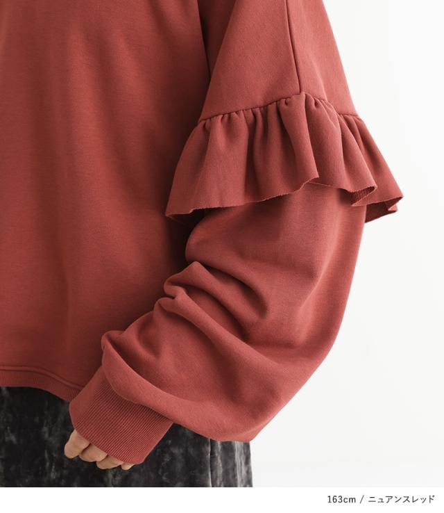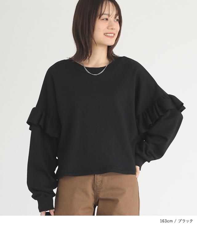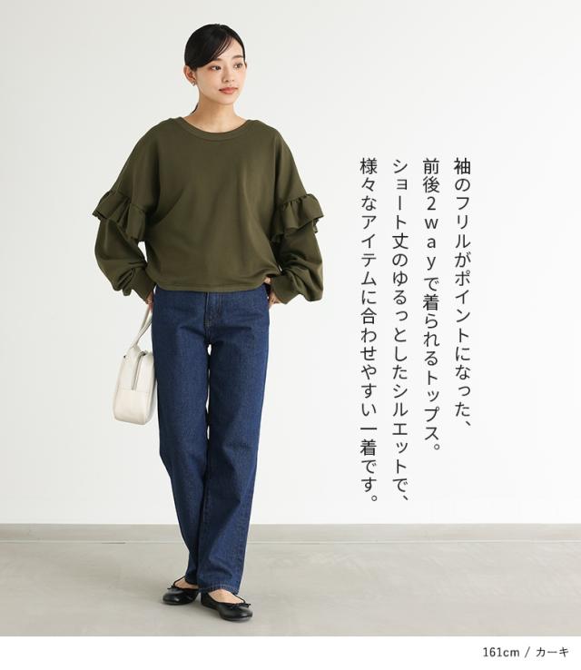 『前後2wayミニ裏毛トップス』【メール便不可】【20】スウェット ボレロ レディース トップス 長袖 クルーネック フリル フリル袖 ショート丈 ショート丈トップス 2way 着回し 袖リブ レイヤード オシャレウォーカー