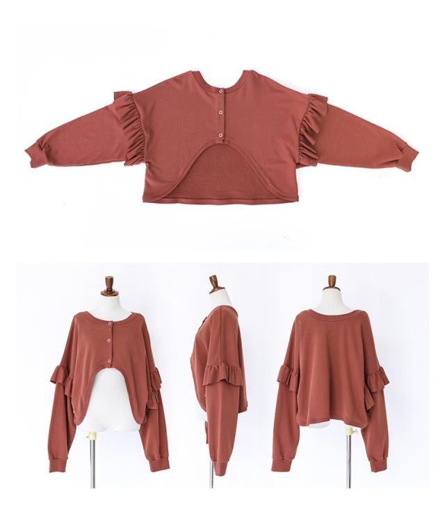■デザイン 袖のフリルがポイントになった、前後で着用できる2wayデザインのトップス。どちらを前にするかで全く異なった雰囲気をお楽しみいただけます。ショート丈のゆるっとしたシルエットで、様々なアイテムに合わせやすい一枚。 ■素材 コットン混のさらりとした肌触りのミニ裏毛生地。程良い厚みで季節長くご着用いただけます。 ■コーディネート パンツ、スカートどちらにも合わせやすいデザイン。ボタン側を前にして、インに着用したアイテムをちらっと見せるレイヤードスタイルもおすすめです。ボタンを開けてボレロ風の羽織りとしても着回していただけます。 |