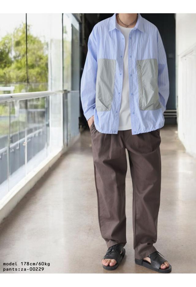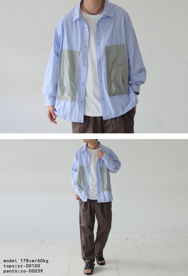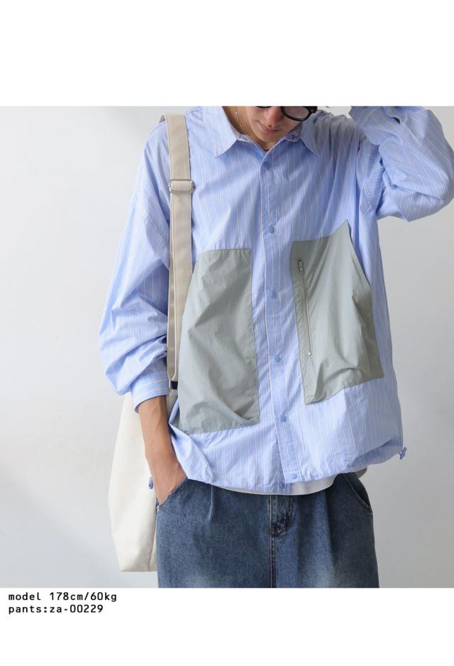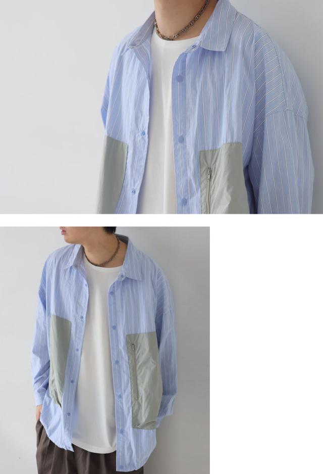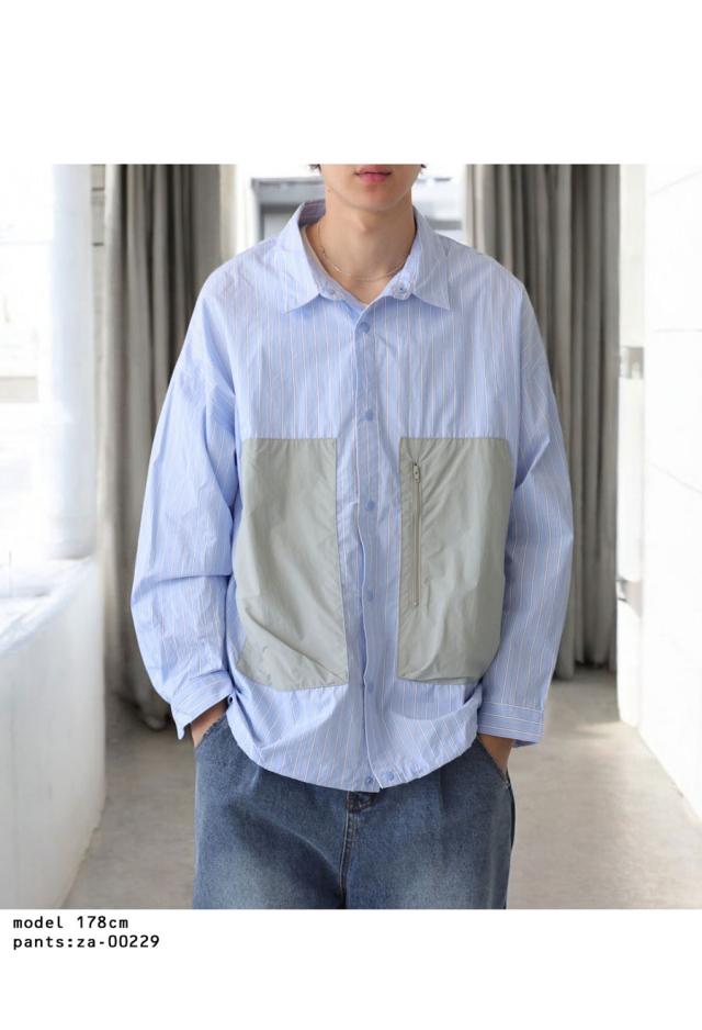 zk-00186z 柄シャツ 柄 切り替え 無地切り替え 配色 レギュラカラー シンプル ゆったり 羽織り 前開き ストライプ シェルボタン 上品 繊細 綿 コットン ドロスト ポケット付き