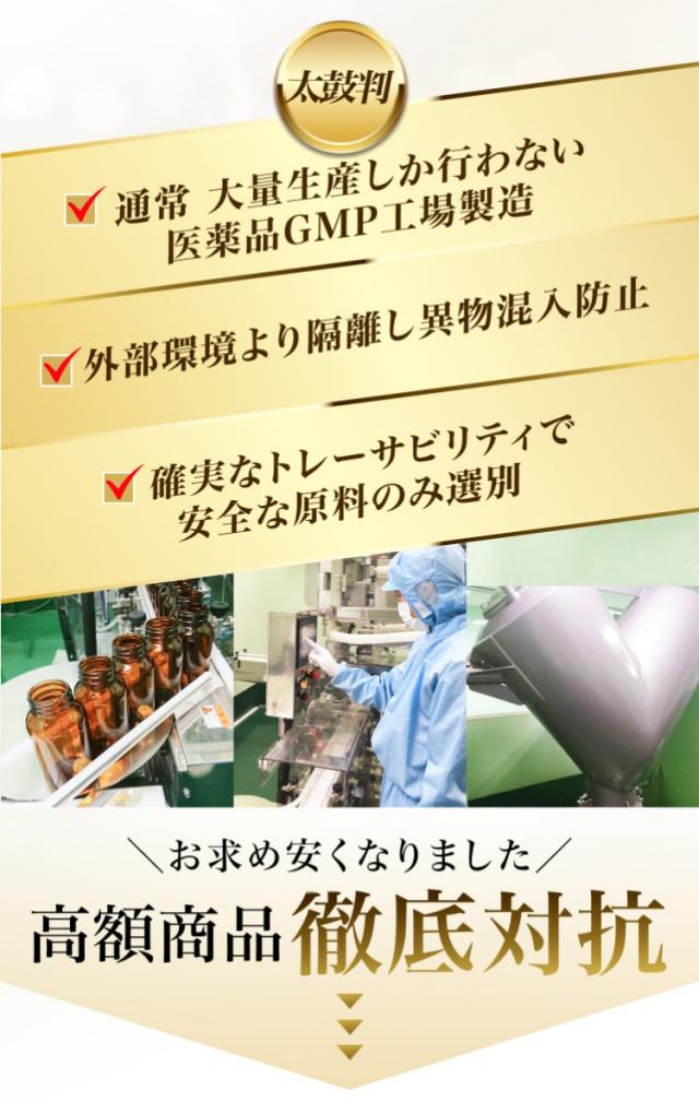 ・世界の厳しい安全基準に合格した安全認定工場指定製造(食品工場や健康食品GMP工場製造ではありません)で、高品質を維持できますよう管理しています。