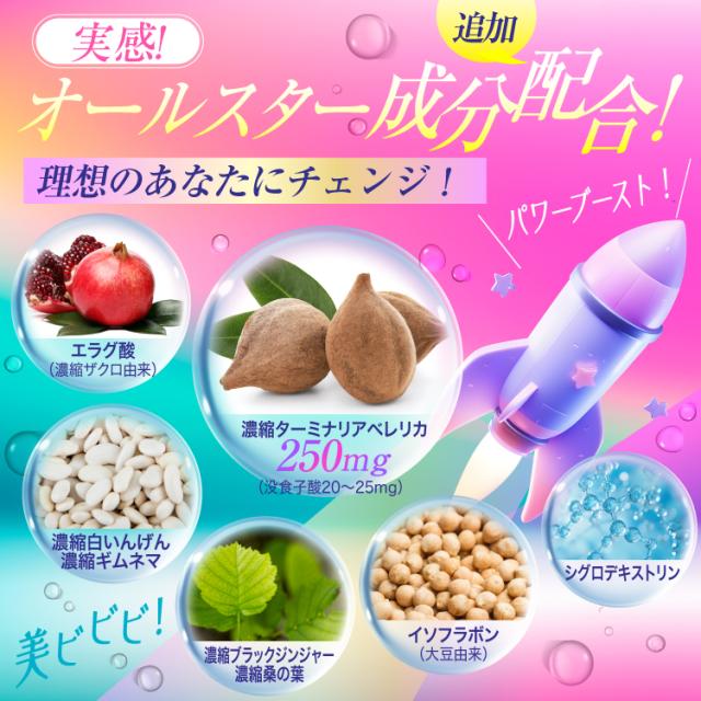 ・原材料:ターミナリアベレリカ抽出物、ギムネマ抽出物、白インゲン抽出物大豆イソフラボン(イソフラボン含有)、ザクロ抽出物、ブラックジンジャー抽出物(ブラックジンジャーエキス、デキストリン)/シクロデキストリン、桑の葉エキス末/結晶セルロース、ステアリン酸カルシウム、微粒二酸化ケイ素