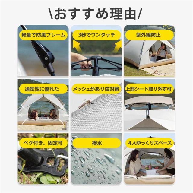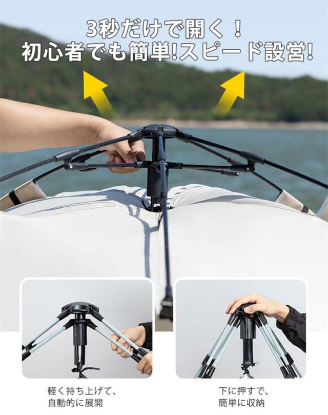 約10秒だけで簡単に設置でき、4人用大空間のワンタッチテント!