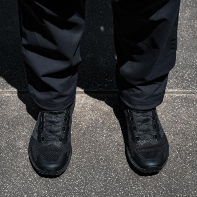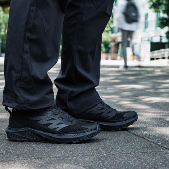“ここの色が落ち着いた配色だったら…。” “ロゴや製品名がもっと目立たなければ…。” 普段履きとしてのスペックを十二分に満たすトレイルランニングシューズの唯一気になるポイントが、カラーやデザインではないでしょうか。SENSE RIDE 5 SRはそんな需要を満たす、ブラックカラーをベースとしたデザインの普段履き、一般作業、業務用シューズとしての着用もおすすめの一足です。機能面でも、ベースのSENSE RIDE 5の履き心地はそのままに、インドアの床でも滑りにくいアウトソールとなっています(ASTM F2913 規格に準拠)。