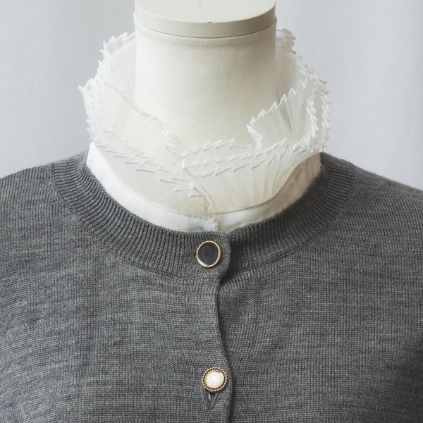 重厚感のある3重仕立てのチュールつけ衿。プリーツ加工のひらひらとしたデザインが首周りを華やかに演出してくれます。上品でクラシカルな印象を与えるスタンドカラーも魅力的。ボタンの開閉によって簡単に着脱できる前開きタイプでストレスフリーな着用感に。クルーネックのトップスやカーディガンとレイヤードすれば、雰囲気の変化を楽しむことができます。
