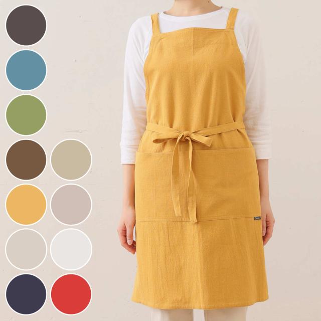 背中で肩ひもがクロスしているタイプのエプロンです。 主に腰の紐でエプロン自体を支え肩ひもに重さがかからないため、首掛けタイプに比べて着用時の疲れが軽減されます。エプロンといえばこれという人気のタイプです。綿100%のさらっとした着心地で、家事やガーデニングなど様々な用途にお使いいただけます。