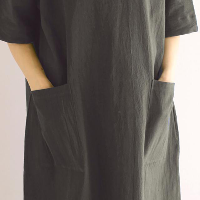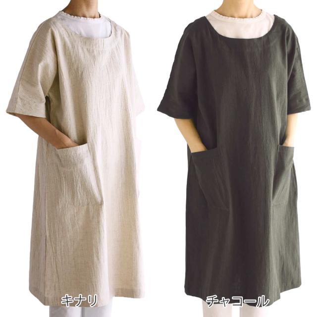 ゆったりとした身幅のシルエットで身体のラインを拾わない、ワンピースのようなエプロンです。上からすっぽり被るタイプで簡単着用です。綿麻生地のさらっとした着心地で、家事やガーデニングなど様々な用途にお使いいただけます。