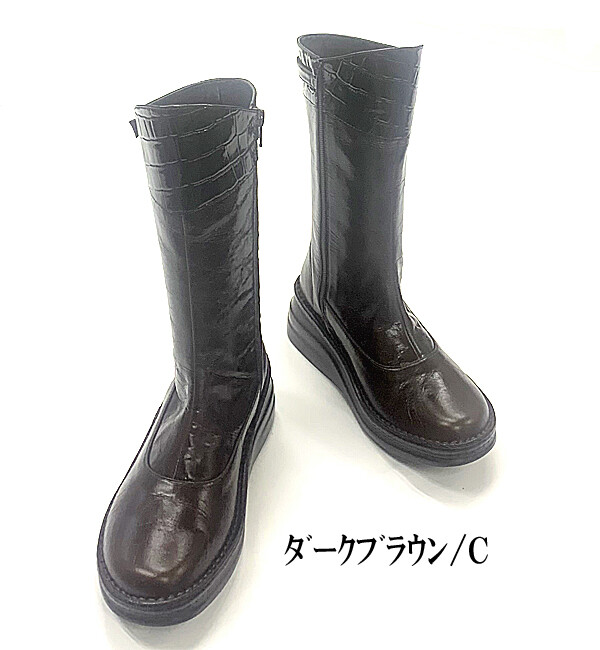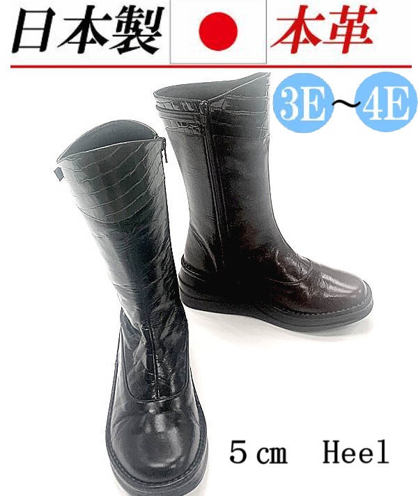 日本製 本革 ミドルブーツ レディース レザー ブーツ ウェッジヒール 5cm 厚底 幅広 3e 4e 外反母趾 クロコ型押し エナメルコンビ