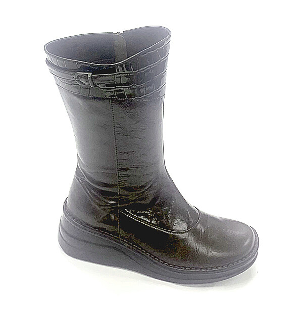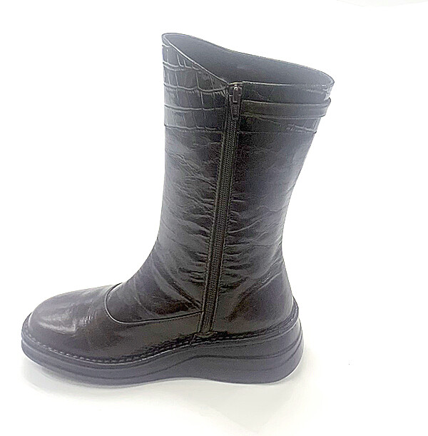 クロコ型押しのエナメル素材と牛革スムースのコンビがクールでエレガントなミドル丈ブーツ!