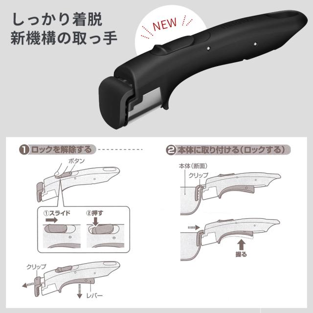 取り付け・取り外しが片手で簡単に行えます。持っているだけでは脱落しない安全設計です。