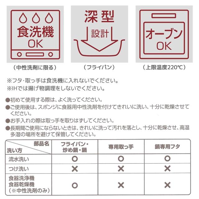 食洗機OK!フライパン・鍋本体は食洗機で洗うことができます。※取っ手は食洗機に入れないでください。また、洗剤は中性洗剤をお使いください。