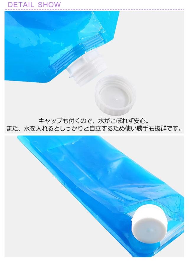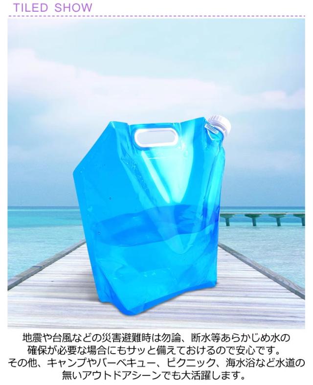| 2個セット!地震や台風などの災害避難時は勿論、断水等あらかじめ水の確保が必要な場合にもサッと備えておけるので安心です。その他、キャンプやバーベキュー、ピクニック、海水浴など水道の無いアウトドアシーンでも大活躍します。 安全性無毒で環境に優しい、長持ちで耐用性があります。キャップも付くので、水がこぼれず安心。また、水を入れるとしっかりと自立するため使い勝手も抜群です。 持ち運びに便利なハンドル付きなので外出でもご利用いただけます。ポータブルで折り畳み式ウォーターバッグ。 バーべキュー、キャンプ、防災、アウトドアに最適! | |