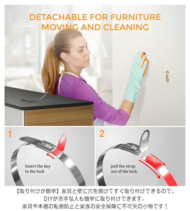 | ステンレス結束バンドで長さ調整ラクラク♪ 家具固定・転倒防止、耐震ストッパー。 【転倒防止金具】地震や偶発的な衝突による家具や本棚の転倒防止。小さなお子様のいる家庭では、お子様による転倒アクシデントの防止にも役立ちます。家族やペットが時間を楽しむための安全な環境を提供します。 【優れた耐震性能】冷間圧延鋼コの字金具とステンレス製結束バンドで、最大130KGの荷重に簡単に耐えることができ、耐震性能に優れています。 【取り付けが簡単】家具と壁に穴を開けてすぐ取り付けできるので、DIYが苦手な人も簡単に取り付けできます。家具や本棚の転倒防止と家族の安全保障に不可欠の小物です! 【ベルト長さ調節楽チン】結束バンドタイプのベルトなので、家具や取り付け場所に合わせて、家具と壁の距離調整がラクラク。 【使用範囲が幅広い】こちらの金具は大部分の家庭用家具に適しています。本棚スリム、コーナーラック、タンス、突っ張りラック、テレビラック、脚立、大型ラック、食器棚や収納棚など広い場所に使われています。 | |