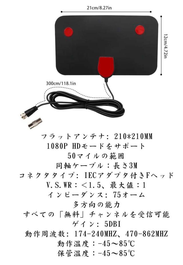| フラットアンテナ: 210*210mm 1080p HDモードをサポート 50マイルの範囲 同軸ケーブル:長さ3m コネクタタイプ: IECアダプタ付きFヘッド V.S.WR:<1.5、最大値:1 インピーダンス: 75オーム 多方向の能力 すべての「無料」チャンネルを受信可能 ゲイン: 5DBI 動作周波数: 174-240mhz、470-862mhz 動作温度:-45〜85℃ 保管温度:-45〜85℃ | |