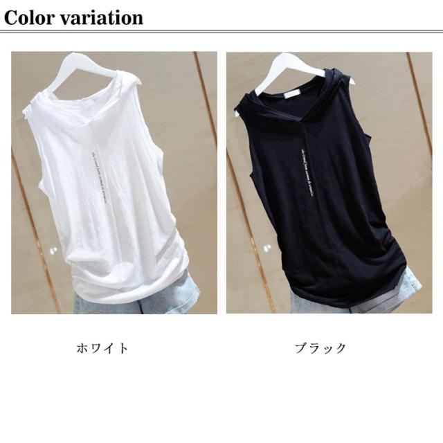 | お洒落感カジュアルフード付きTシャツ。 柔らかくて着用時にごわつき感もないのが◎素肌に触れても快適な仕上がりに。 重ね着しやすいノースリーブ仕様となります。 単品一枚でもジャケットのインナーでも使えて、一枚あると万能なitem | |