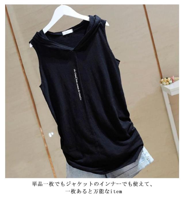 | お洒落感カジュアルフード付きTシャツ。 柔らかくて着用時にごわつき感もないのが◎素肌に触れても快適な仕上がりに。 重ね着しやすいノースリーブ仕様となります。 単品一枚でもジャケットのインナーでも使えて、一枚あると万能なitem | |