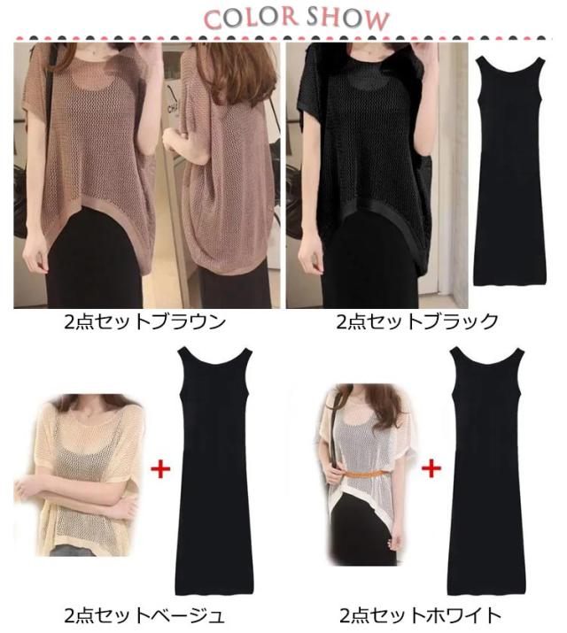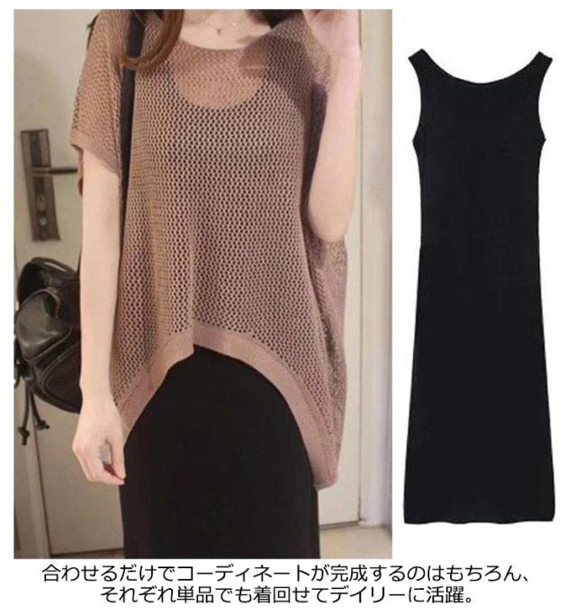 体型カバー 2点セット『 × 透かし編み 』 レイヤード ワンピース ワンピ ロングワンピ ニット ペチコート ニット ロング トップス メッシュ ロングワンピース レディース マキシ インナー マキシワンピ 重ね着 セットアップ ノースリーブ タンク 白 黒 春