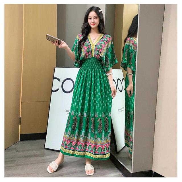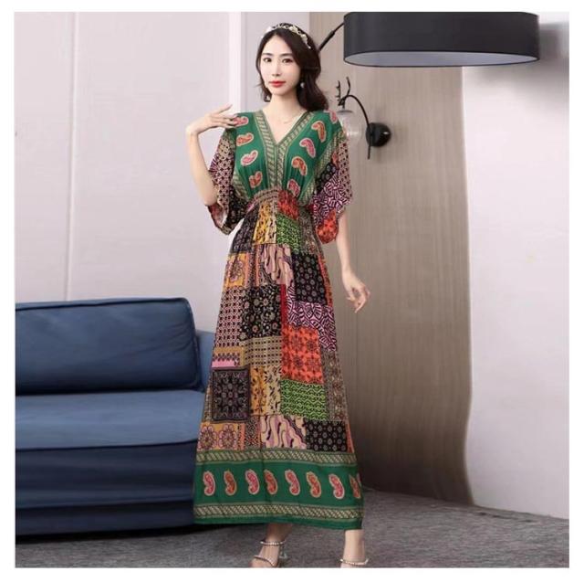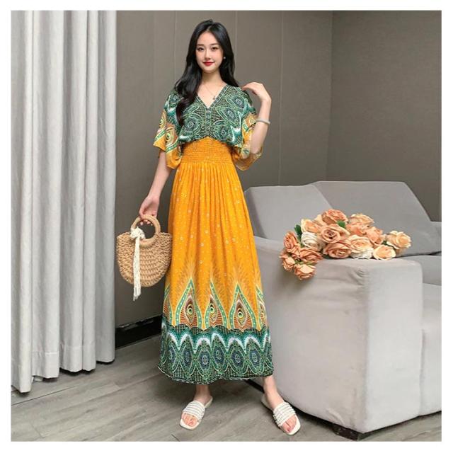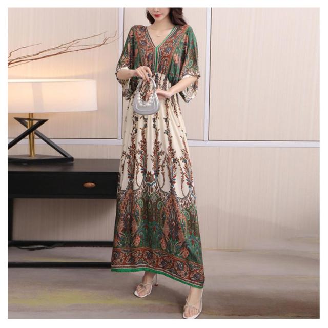 夏柄ワンピース マキシ ペイズリー柄 レディース 体型カバー Vネック ワンピース 柄ワンピ 春夏 洗える ワンピース 軽い 大人 ボタニカル柄マキシ ロング丈マキシ 総柄 タイル柄 ロング丈マキシワンピース リゾート リラックス フレンチスリーブ 半袖
