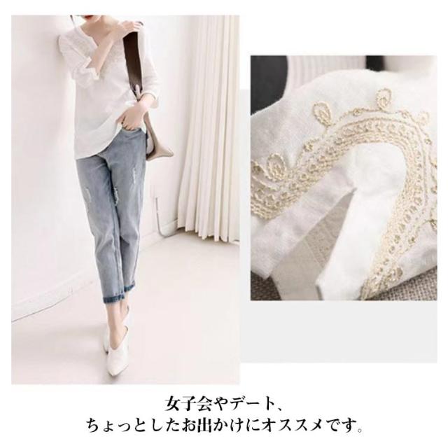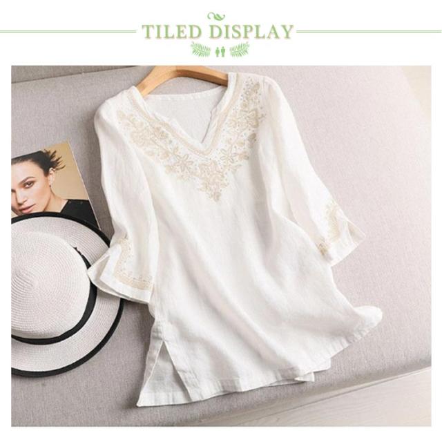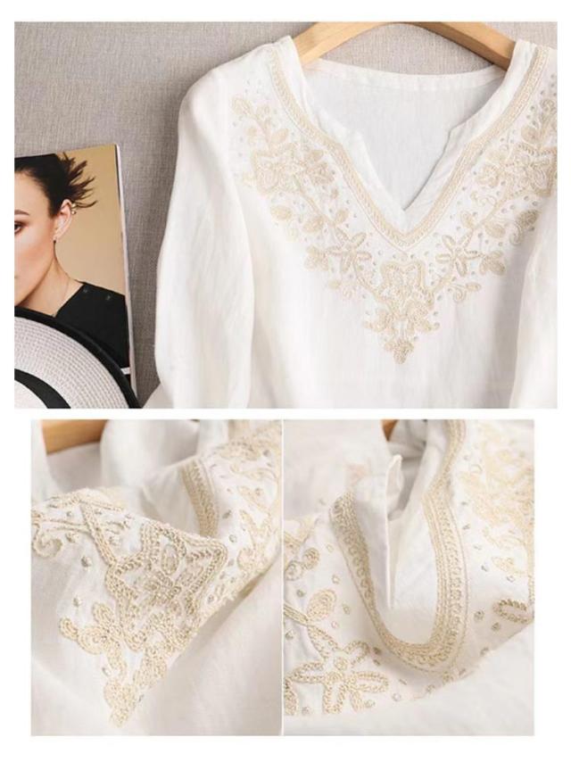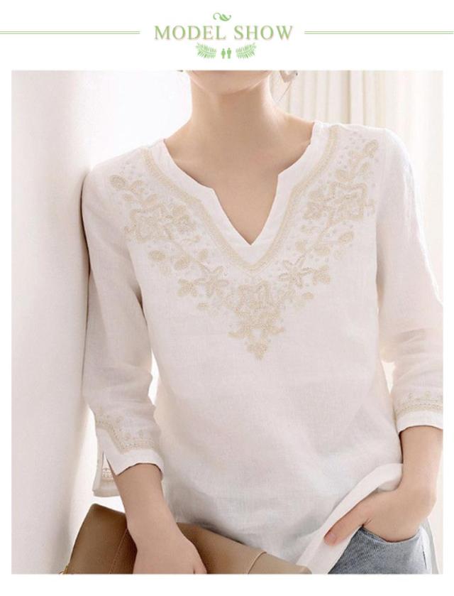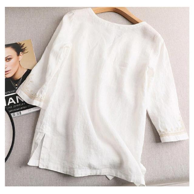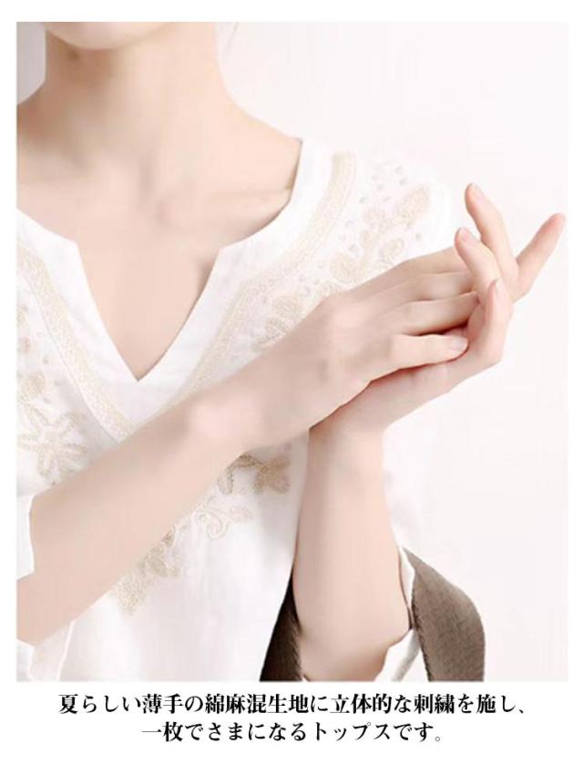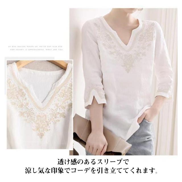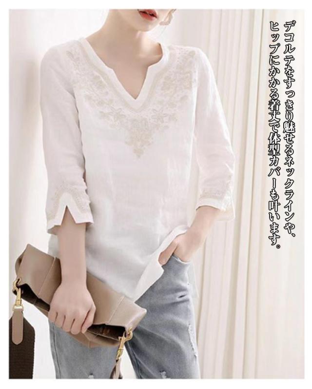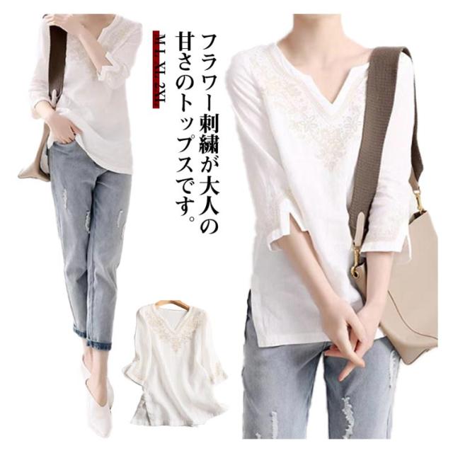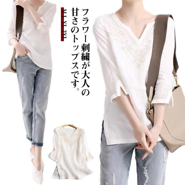トップス 刺繍 刺繍 ブラウス キーネック 七分袖 レディース Tシャツ 花柄 プルオーバー 花柄 リネンタッチ チュニック トップス カットソー サイドスリット 刺繍ブラウス 刺繍プルオーバー 大人 かわいい ナチュラル
