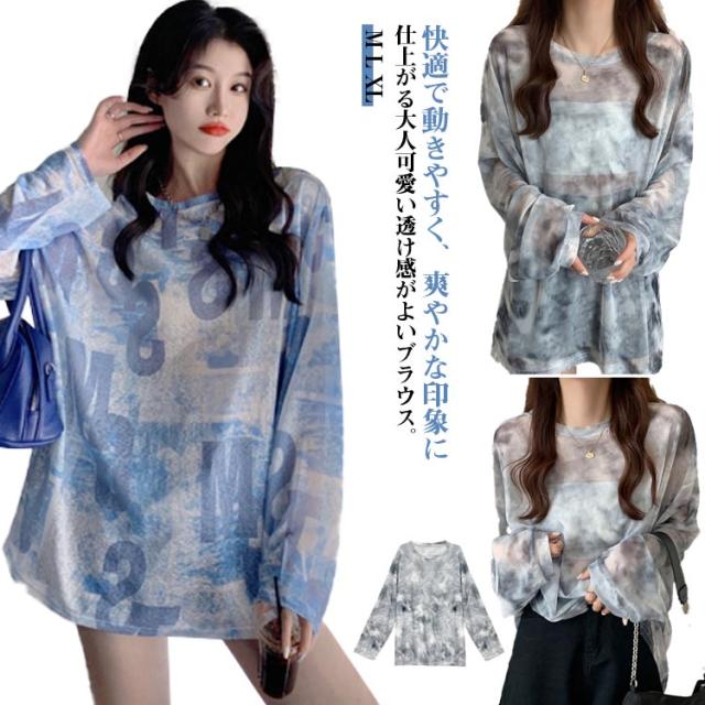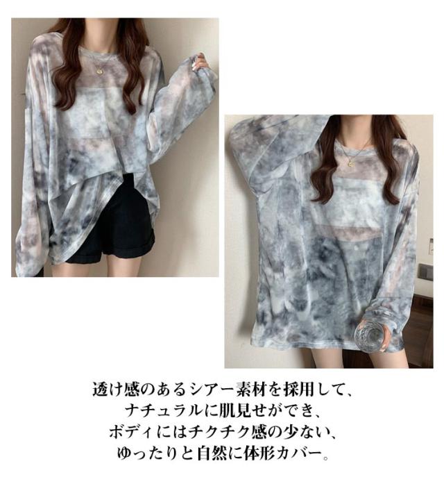 薄手 シアーTシャツ シアーブラウス インナー 長袖 タイダイ柄 レディース 肌見せ トップス 長袖 シースルー 重ね着風 透け シースルー UVカット カジュアル ダンス衣装 体型カバー ビッグシャツ 透け感 シースルー UV