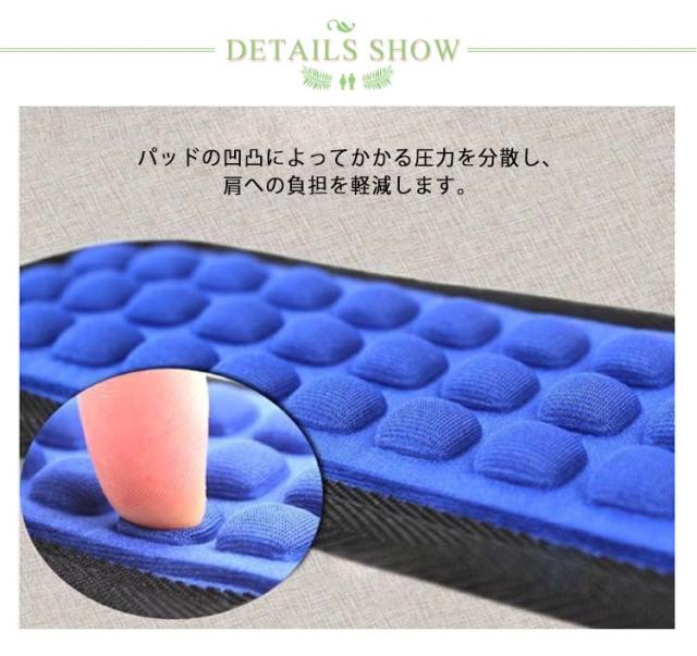 | 肩への負担を軽減、お手持ちのリュックにつける肩クッション。 重いバッグを長時間背負っていても痛くなりづらく、蒸れにくい作りとなっています。 パッドの凹凸によってかかる圧力を分散し、肩への負担を軽減します。 取り付けたい位置に合わせ、マジックテープを留めるだけで簡単に装着することができます♪ PCバッグ、ボストンバッグ、スポーツバッグ、ゴルフバッグなど色々な肩掛けベルトに装着して使用できます。 毎日登下校するお子様へのサポートにピッタリのアイテムです♪ | |