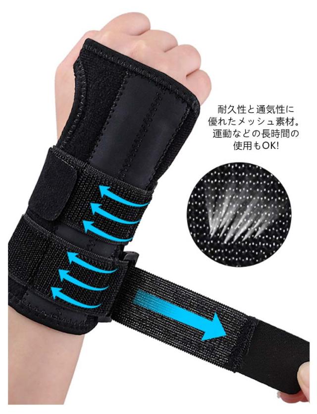 | 強い固定力とフィット感ながら、手首をがっちり固定!!! 手首サポーター 男女兼用・左右別 【2枚セット】 腱鞘炎、捻挫の手首を固定でき、運動中手首にサポート力を提供でき、固定感も保護性も抜群である手首保護用サポーターです。 手のひら側と甲側のサンドイッチ構造。硬性で軽い金属プレートが内蔵され、幅広設計のためホールド力UP! 耐久性と通気性に優れたメッシュ素材。運動などの長時間の使用もOK! 不都合な手首のねじれや、掌屈(しょうくつ)背屈(はいくつ)の動きを抑制。スポーツ時も、普段の生活の中でも使用可能。 手首から手の甲まで全体的に手首をがっちり固定。それでも指は動きます。 手根管症候群の方にもおすすめです。 | |