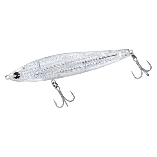 魅惑の可変S字スラロームアクションで泳ぐ、レーザーインパクト搭載フローティングスイミングペンシル。タダ巻きひとつで表層付近をS字軌道を描きながらオープンエリアにいるシーバスを「誘き寄せて釣る!!」水深0〜50cmまでのレンジをロッド操作とリトリーブスピードをコントロールすることで攻略可能。空気抵抗を抑えたボディ形状と、立ち上がり向上機能を付加した磁着重心移動システム「MAGROCK+Rシステム」を採用したことで、Ave70m以上の飛距離とシーバスに見切られにくい立ち上がり性能を両立。この可変S字アクションを最大限に引き出す使い方はスローリトリーブ。不規則にS字蛇行しながらフィッシュイーターに追われている小魚のように泳ぎ、リトリーブスピードや流速の変化などで自動的にヒラ打ちやI字アクションを発生。「食わせの間」をルアーが勝手に演出することで、昼夜問わず誰でも簡単にシーバスの捕食スイッチを入れることが可能。