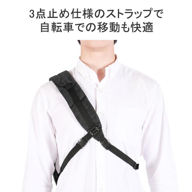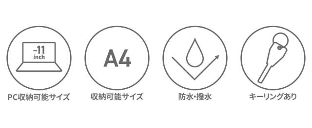 | 仕様 | <外側> メッシュジップポケット(L)×1 └ 内蔵 ポケット(M)×1 ポケット(S)×1 ペンホルダー×1 キーホルダー×1(取り外し可能) メッシュジップポケット(M)×1 <内側> PC収納×1 メッシュジップポケット(M)×1 |