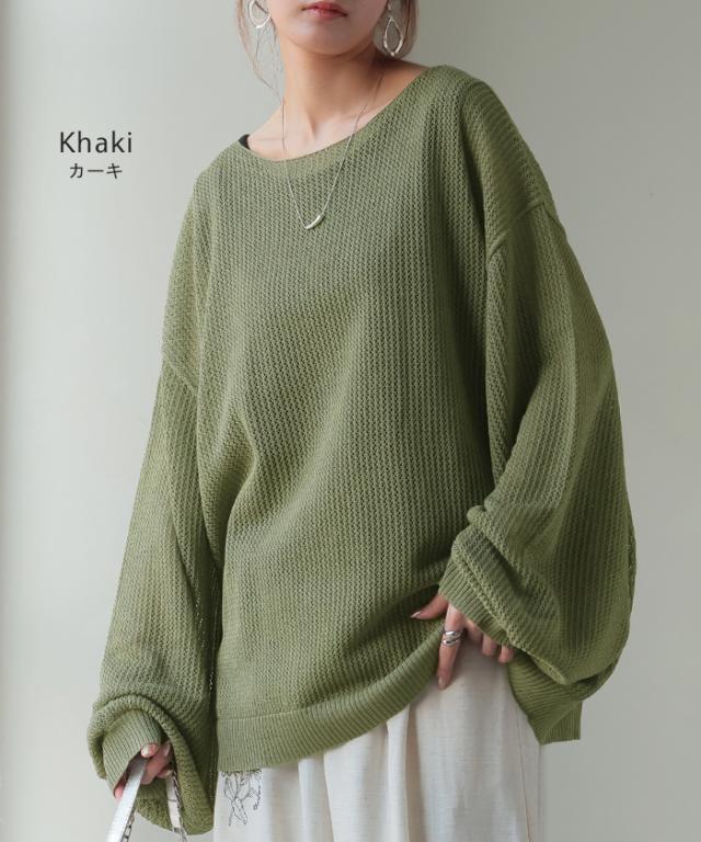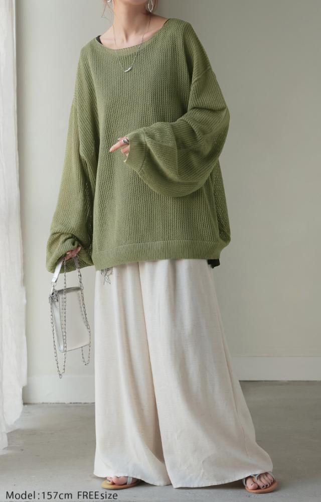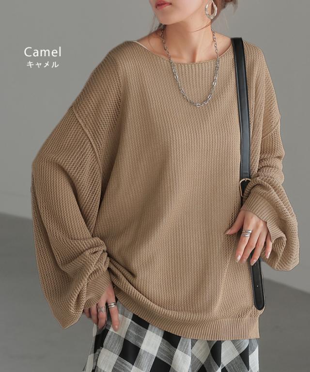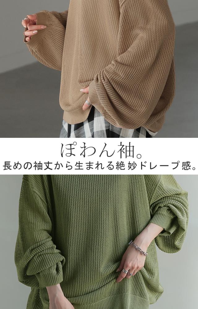 メッシュ編みを使用しレイヤードを楽しめるボリューム袖ラメニットです。