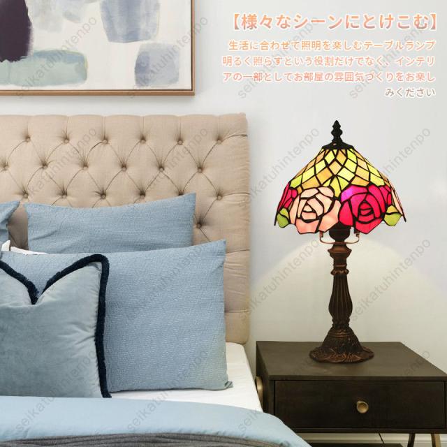 【多用途】玄関、トイレ、通路、階段、流し元、ベットサイド、ダイニングルーム、書斎などの1灯照明としてピッタリ。リビング、ダイニングなど広めの場所の主役照明。レトロな雰囲気が感じられるステンドグラス風シェードのテーブルランプ。