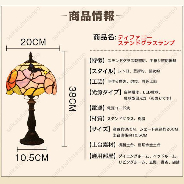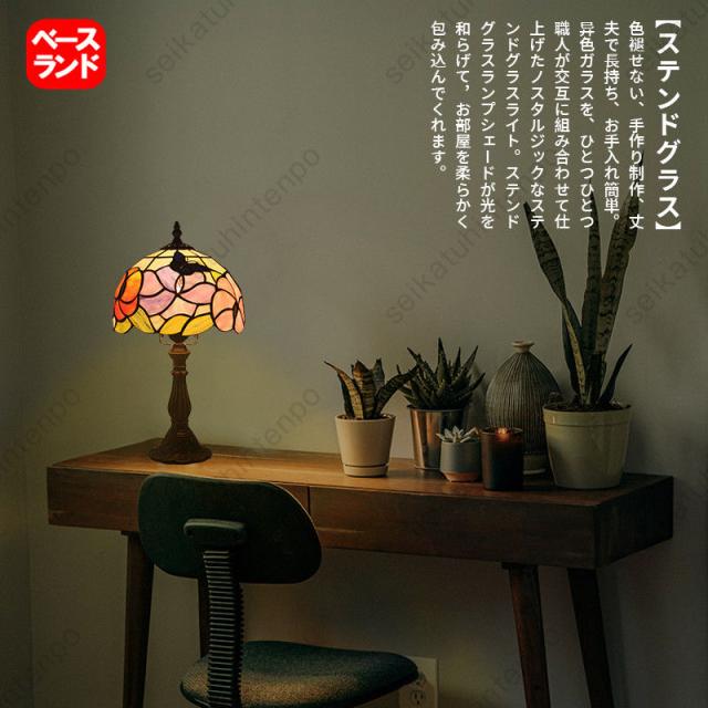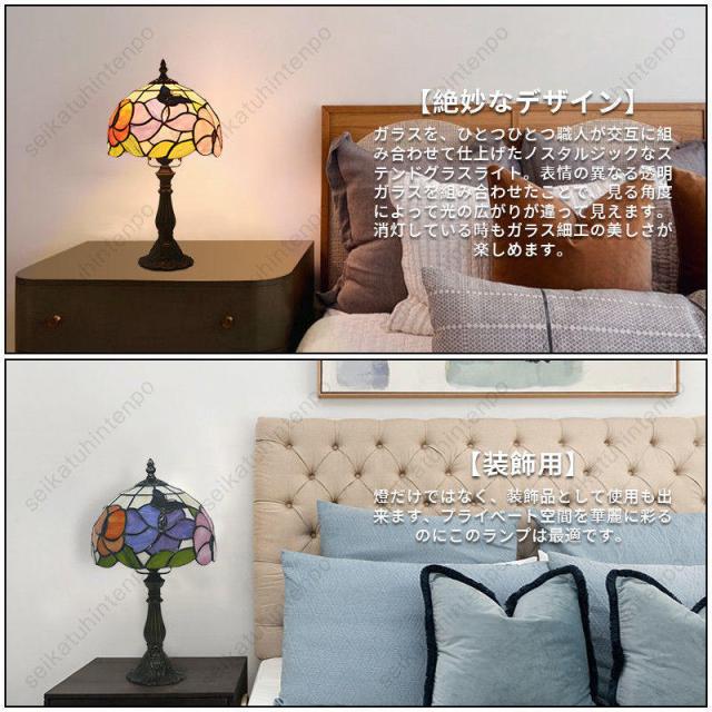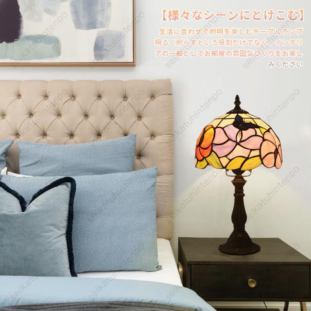 【多用途】玄関、トイレ、通路、階段、流し元、ベットサイド、ダイニングルーム、書斎などの1灯照明としてピッタリ。リビング、ダイニングなど広めの場所の主役照明。レトロな雰囲気が感じられるステンドグラス風シェードのテーブルランプ。