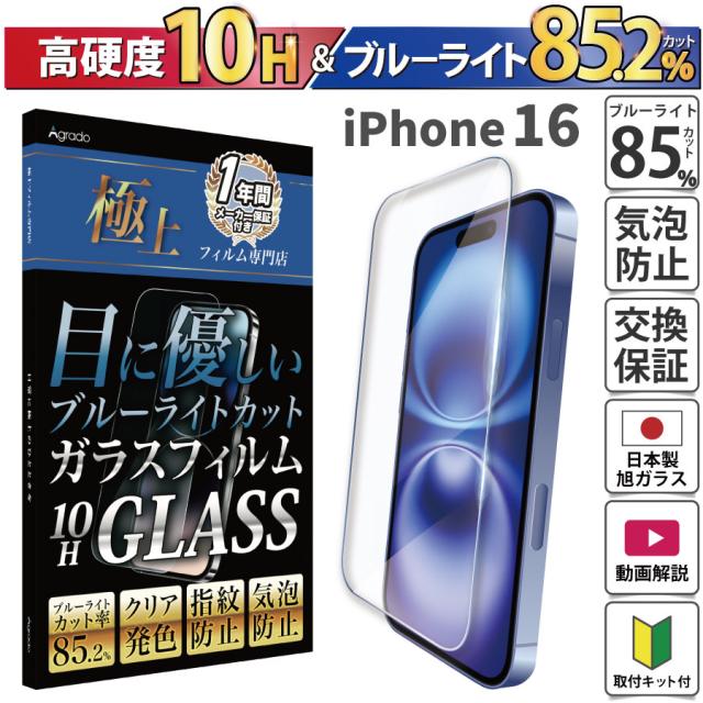iPhone 16 ガラスフィルム ブルーライトカット かんたん 安心 日本製 透明ガラス 85.2%カット 保護 スマホフィルム 強化ガラス 旭硝子製 保証 アイフォン アイホン おまけ付き 防水ケース ポイント消化 送料無料