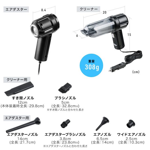 ⇒ご購入の前にご確認下さいシガーソケットから電源を取るタイプのカークリーナー。エアダスターとしても使用可能。コードは2.5mあり後部座席でも使用可能。多彩なアタッチメント付き【WEB限定商品】