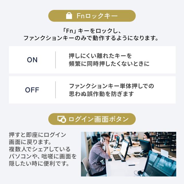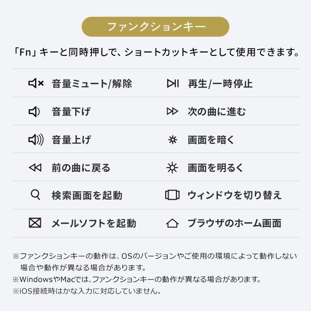 ※ノートパソコンや各メーカー純正キーボードのファンクションキーにあらかじめ割り付けられている特殊機能(画面の明度調整やボリュームのアップダウンなど)は、このキーボードからは操作できません。