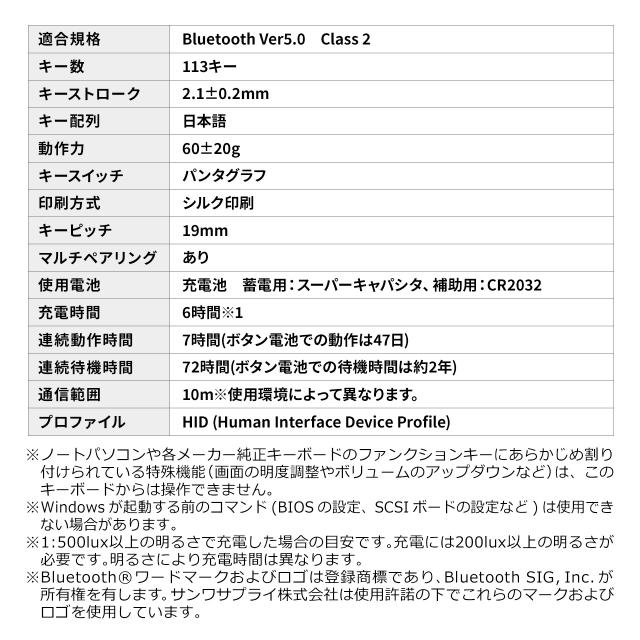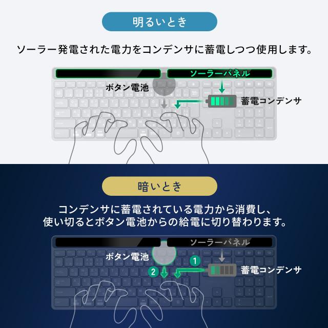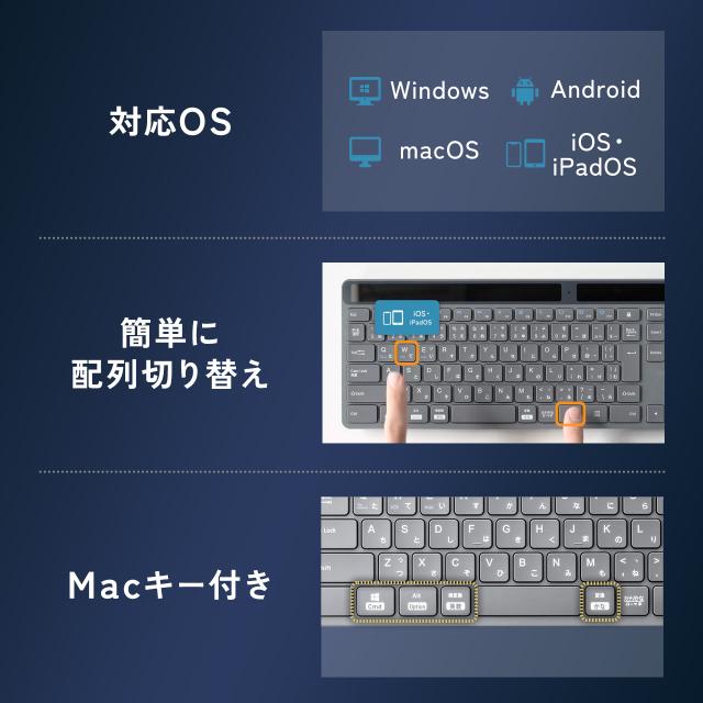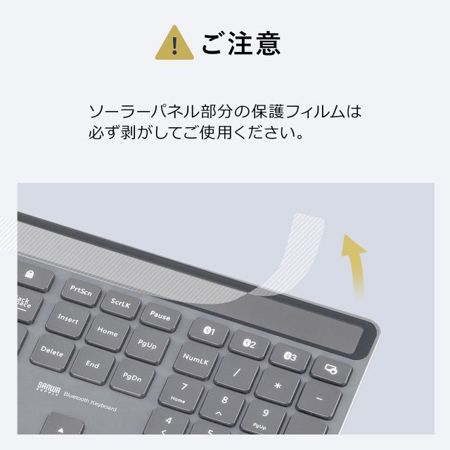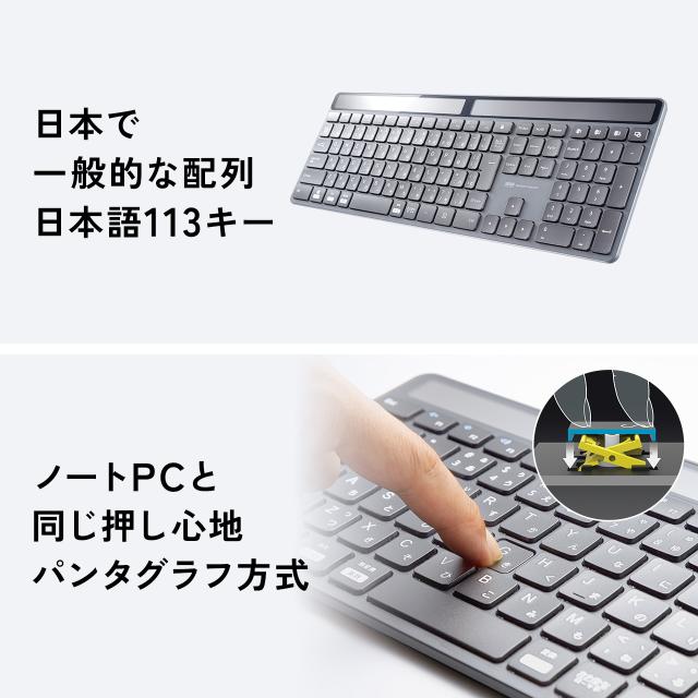 ⇒ご購入の前にご確認下さい部屋の明かりで充電できるソーラー充電対応Bluetoothキーボード。ソーラー充電なので電池交換や充電作業が不要。マルチペアリングに対応で最大3台機器を登録可能。パンタグラフキーを採用。Win/Mac/iOSに対応。【WEB限定商品】