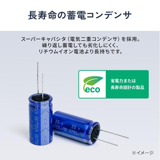 ●蓄電用に電気二重層コンデンサ(スーパーキャパシタ)を使用しています。繰り返し充電に強くリチウムイオン電池に比べ長寿命です。