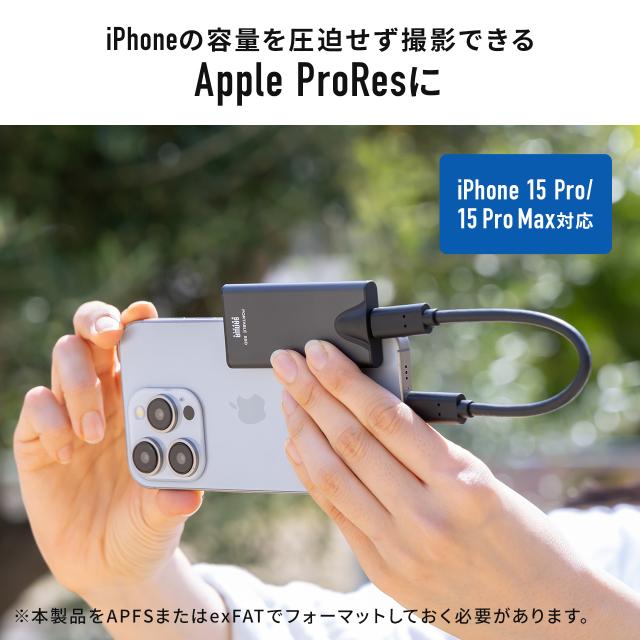 ●Apple ProResに対応しており、高品質動画をSSDに直接保存できるため、iPhone15Proの容量を圧迫することなく撮影が可能です。