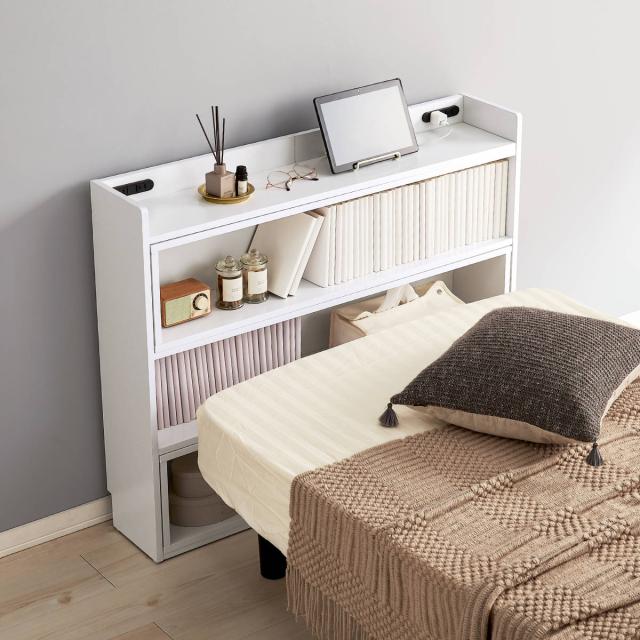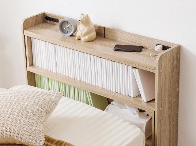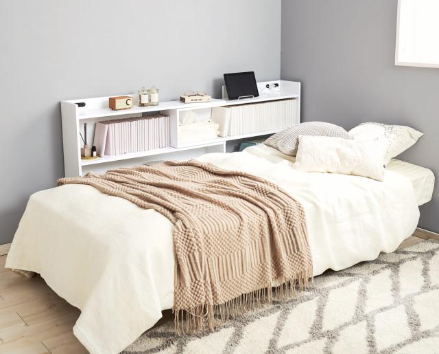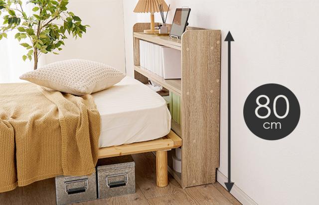 脚付きマットレスや、ヘッドレスベッドに後付けで設置できるヘッドボードです。一般的なベッドフレームに合わせやすい高さ設計で、眼鏡や本など、枕元に置いておきたい小物をスッキリと収納できます。