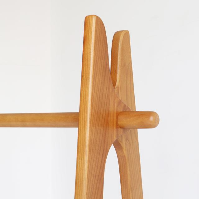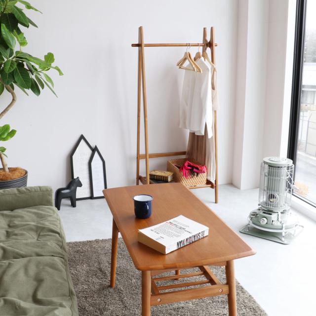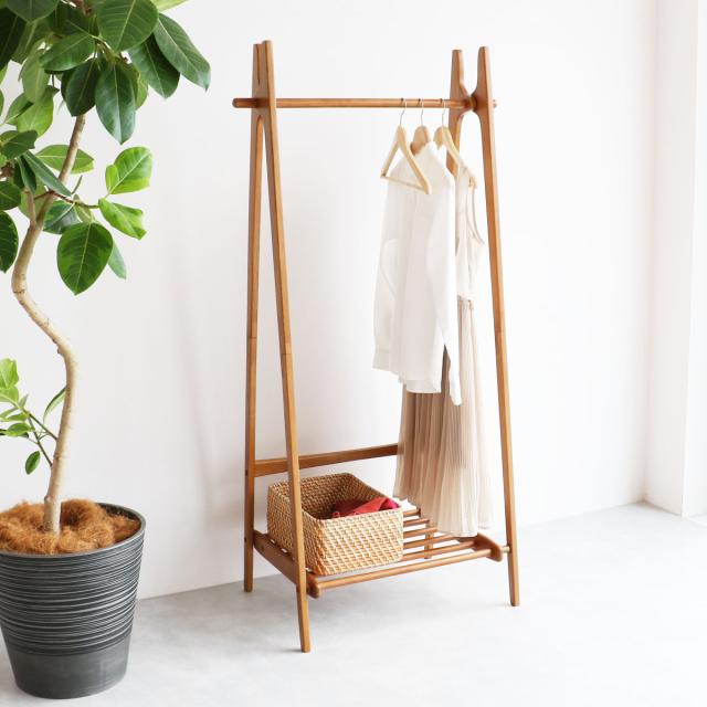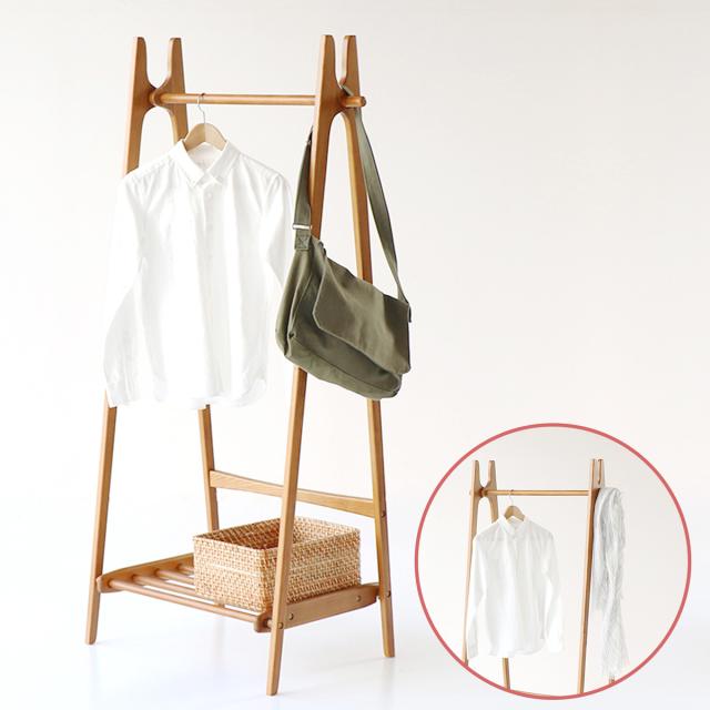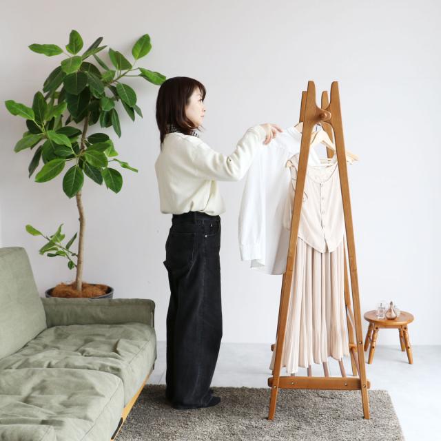 アッシュ無垢材を使用したナチュラルな雰囲気のハンガーラックです。細身でスッキリとしたデザインは、お部屋に圧迫感を与えません。コンパクトサイズなので、ワンルームにお住いの方やひとり暮らしの方にもオススメです。