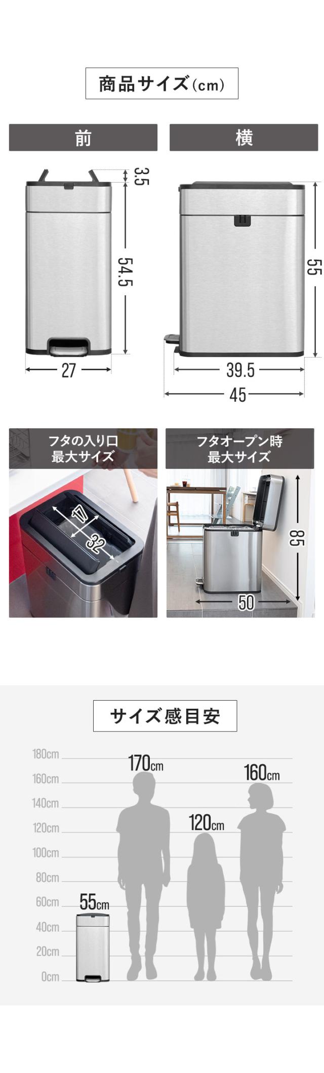 | ■本体サイズ: (約)幅27cm×奥行45cm×高さ55cm ※フタを開けた時の最大高さ:(約)58cm ■インナーバケツのサイズ: 内寸:幅22.5cm×奥行33cm×高さ38cm 外寸:幅24.5cm×奥行35cm×高さ39cm |
