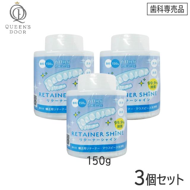 | 《リテーナーシャインとは》 リテーナーシャインは、歯科矯正用のリテーナーや床装置のプラークコントロールのために開発された専用洗浄剤です。 漂白成分とタンパク質分解酵素による優れた洗浄力により、リテーナーの汚れやイヤな臭いを除去します。 (1回2.5g:60回分) 《特長》 ◎金属にも優しい 入れ歯洗浄剤の中には、装置の金属部、特に鑞着部を溶かしてしまい、長期間使用していると装置が壊れてしまうことがありますが、リテーナーシャイン顆粒は、金属に優しい成分で、金属をほとんど溶かしませんので、安心して装置を洗浄していただけます。 ◎速い洗浄力 リテーナシャイン顆粒は、その名の通り顆粒になっていますので、水に溶けるのが速く、同時に洗浄力も早くから発揮します。