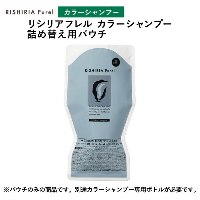 | 商品構成 | リシリアフレル RISHIRIA Furel カラーシャンプー詰め替え用パウチ(240ml)×1袋 ※3色からお選びいただけます。 ・ダークブラウン ・モカブラウン ・ナチュラルブラック ※パウチのみの商品です。別途カラーシャンプー専用ボトルが必要です。 |