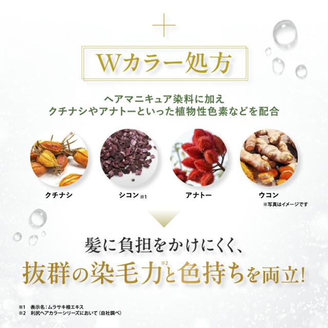 | 内容成分 | 利尻カラークリーム: ベンジルアルコール、ポリアクリレート-13、DPG、ポリイソブテン、ベヘニルアルコール、水添ポリイソブテン、エタノール、乳酸、セタノール、PPG-3カプリリルエーテル、エトキシジグリコール、リシリコンブエキス、カホクザンショウ果実エキス、オレイルアルコール、ニンニク根エキス、ローマカミツレ花エキス、ゴボウ根エキス、アルニカ花エキス、セイヨウキズタ葉/茎エキス、オドリコソウ花/葉/茎エキス、オランダガラシ葉/茎エキス、セイヨウアカマツ球果エキス、ローズマリー葉エキス、ゲンチアナ根エキス、ユズ果実エキス、ヤエヤマアオキ果汁、ボタンエキス、アルテア根エキス、フユボダイジュ花エキス、イソステアロイル加水分解コラーゲンAMPD、デキストリン、センブリエキス、カワラヨモギ花エキス、コンフリー葉エキス、加水分解ケラチン、オタネニンジン根エキス、フェノキシエタノール、BG、ステアリン酸グリセリル(SE)、セチル硫酸Na、トリ(カプリル酸/カプリン酸)グリセリル、ダイマージリノール酸ダイマージリノレイル、フィチン酸、オレンジラフィー油、乳酸Na、イソステアリン酸ソルビタン、ポリソルベート20、香料、ウコン根茎エキス、ムラサキ根エキス、加水分解クチナシエキス、水溶性アナトー、黄4、赤227、黒401、橙205、紫401 りしりリムーバー: ベンジルアルコール、ミリスチン酸、ラウリン酸、水酸化K、デシルグルコシド、パルミチン酸、グリセリン、EDTA-2Na、亜硫酸Na りしり保護クリーム: 野菜油、トコフェロール |