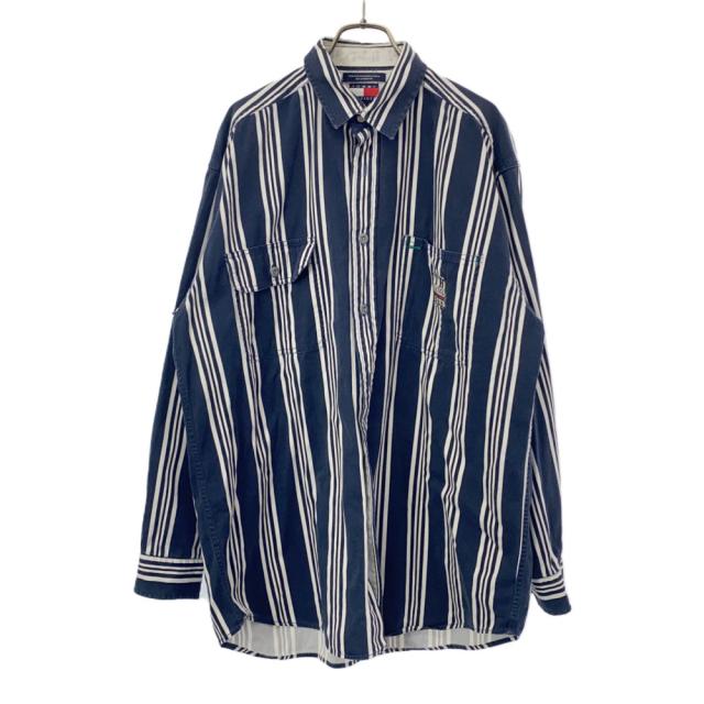 トミーヒルフィガー 90s ストライプ 長袖 フラッグタグ コットンシャツ M ネイビー×白 TOMMY HILFIGER オールド ヴィンテージ メンズ