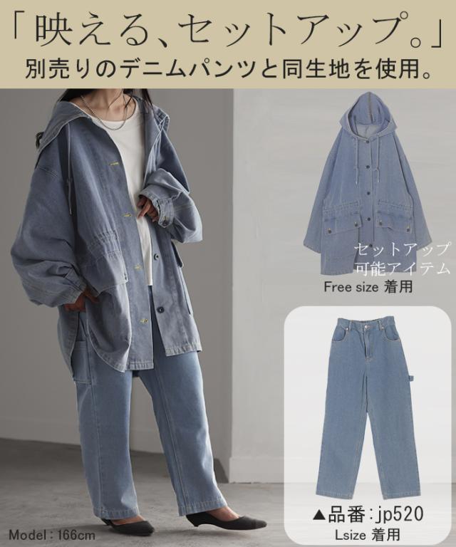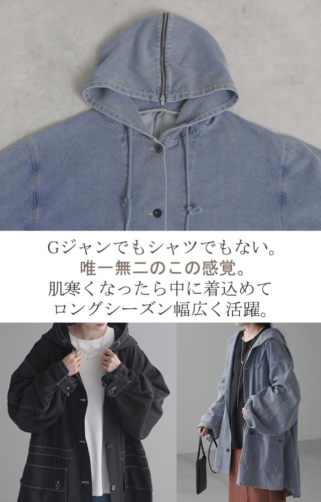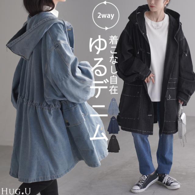 アウター 別売り セットアップ可 「 超ビッグ 」 Gジャン レディース デニム ジャケット ロング ビッグ デニムジャケット チュニック フード セーラー デニムシャツ 羽織 大きいサイズ お尻が隠れる ダメージ ジーンズ 黒 春 夏 HUG.U 秋新作
