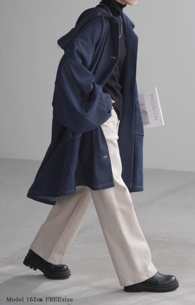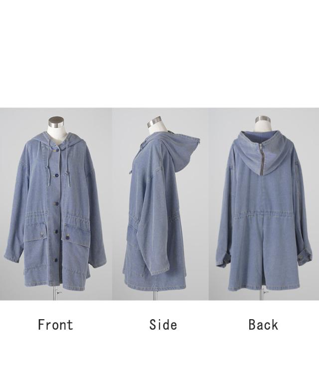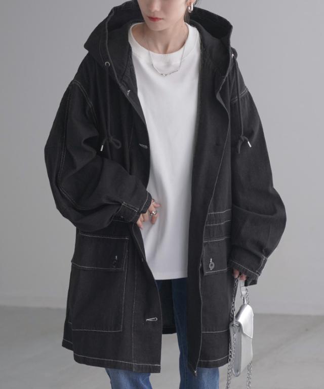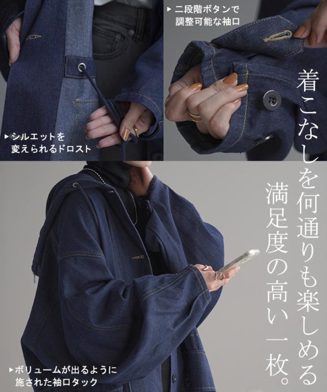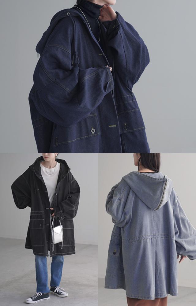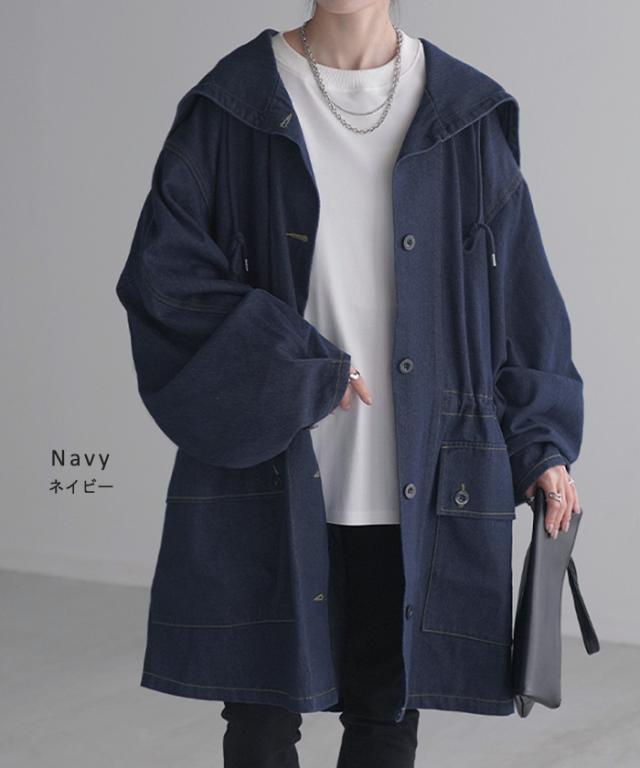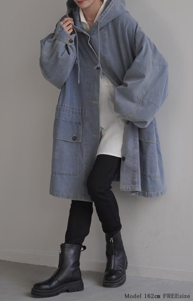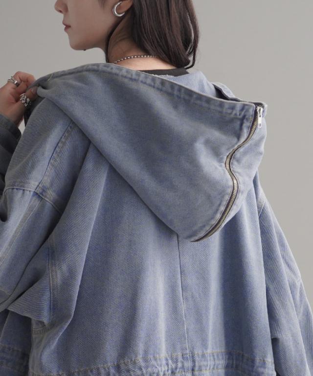 大きなフードが特徴的なミリタリーデニムジャケットです。